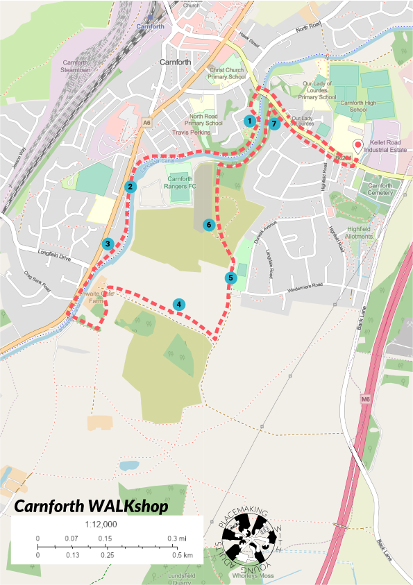 The walkshop, with consented recordings for planning policy dissemination, unfolded in a three-tiered approach. Initially, an introduction to the placemaking framework and Lancaster Local Plan set the stage. Participants then explored Carnforth’s urban layout, traversing the Lancaster Canal path, agricultural fields, and brownfields. As they ventured across the Canal Bridge and through Carnforth Rangers FC’s surroundings, participants used a walking toolkit to capture insights and explore sustainable living methodologies. A communal dinner break offered space for informal reflection between young adults and policymakers, strengthening bonds and fostering dialogue.
